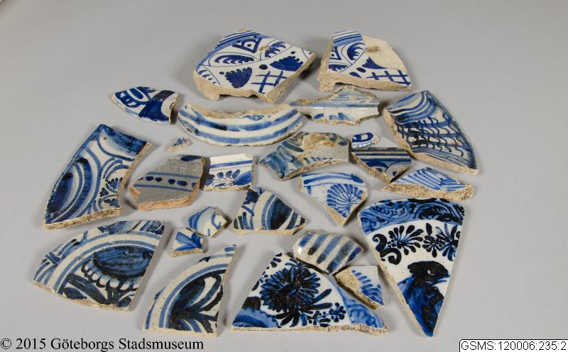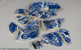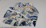 - dekor 3: diverse skärvor med blå och svart dekor invändigt, blommor och geometriskt mönster