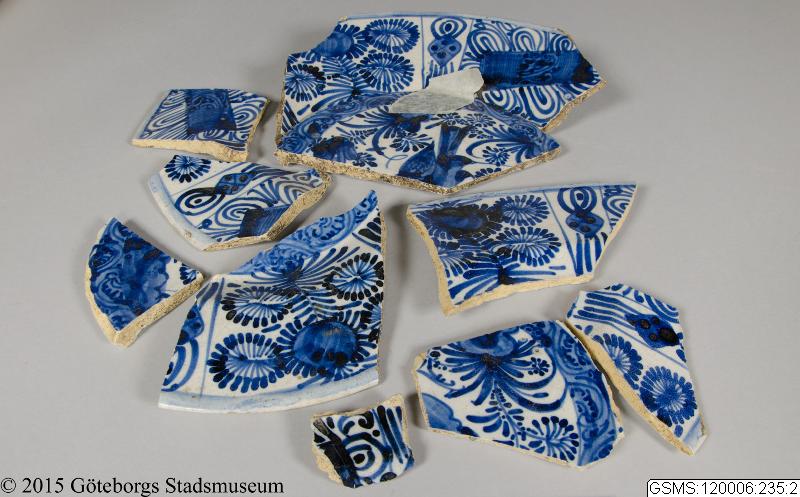 - dekor 1: fat med blå dekor invändigt i form av stiliserade blommor