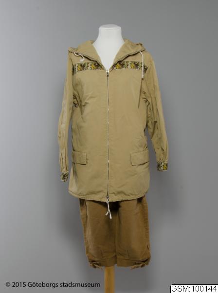 - Skidjacka i beige bomullsväv med kapuschong som stängs med lång dragkedja mitt fram. Lång ärm med rynkat avslut mot smal knappslå som stängs med ett spänne. Två osynliga fickor med ficklock på vardera framstycke. Skärp som går genom två isydda hällor i sidsömmen och tillbaka på ryggen och hålls ihop av ett enkelt spänne. Jackan är dekorerad i brösthöjd mitt fram och på ärmslutens knappslå med band breoderat med bladmotiv i gröna och bruna nyanser. Dragsko med vitt snodd i nederkant och längs med kapuschongen.