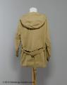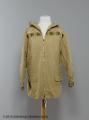 Skidjacka i beige bomullsväv med kapuschong som stängs med lång dragkedja mitt fram. Lång ärm med rynkat avslut mot smal knappslå som stängs med ett spänne. Två osynliga fickor med ficklock på vardera framstycke. Skärp som går genom två isydda hällor i sidsömmen och tillbaka på ryggen och hålls ihop av ett enkelt spänne. Jackan är dekorerad i brösthöjd mitt fram och på ärmslutens knappslå med band breoderat med bladmotiv i gröna och bruna nyanser. Dragsko med vitt snodd i nederkant och längs med kapuschongen.