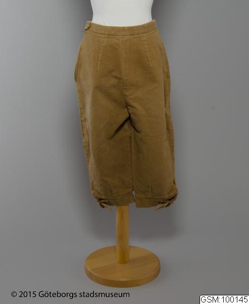 - Knäkorta skidbyxor i brunbeige bomullssammet. Byxorna knäppes under knäet med ett enkelt spänne. Byxorna har insnitt och linning och knäppes i sidan med dragkedja och knapp. Byxorna har även en bakficka med blixtlås placerad högt upp vid ena höften.