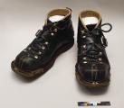 Skidpjäxor i svart läder med snörning med svart-vit snöre i hyskor. Pjäxorna knäppes dessutom med en rem med spänne över snörningen vid vristen. Kängorna är skodda med beige läder på insidan av skaftet och mitt fram i tån finns en förstärkning av gul metall. Sulan är räfflad.