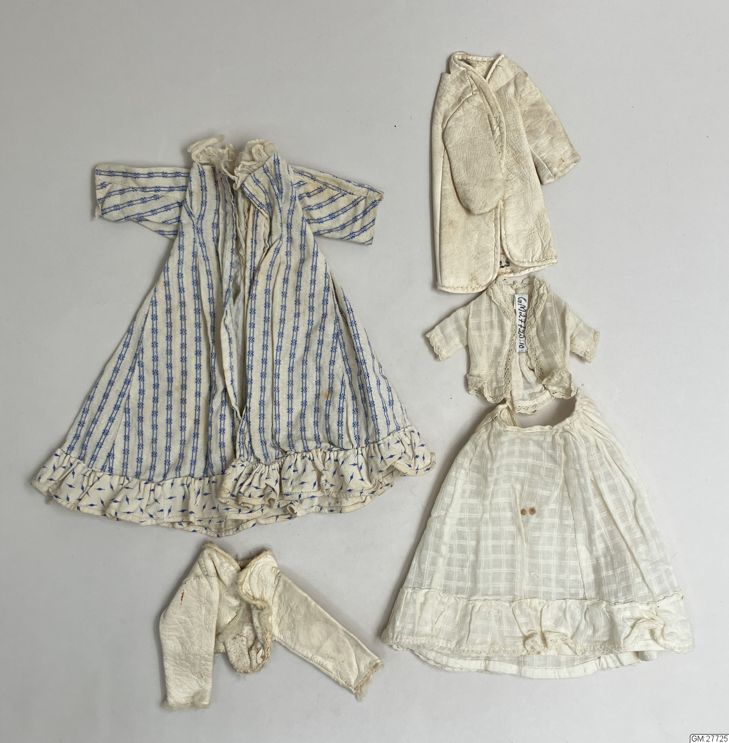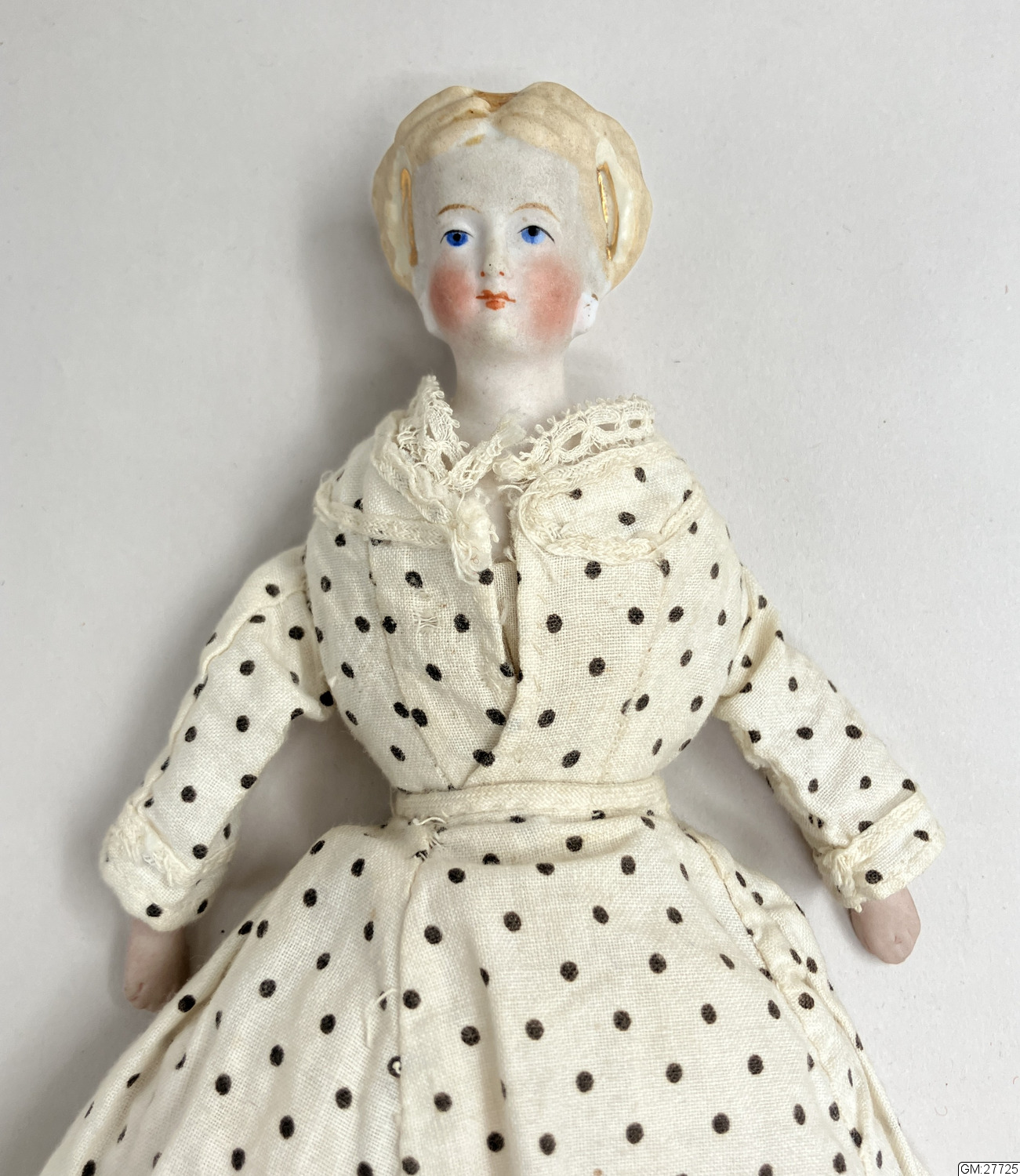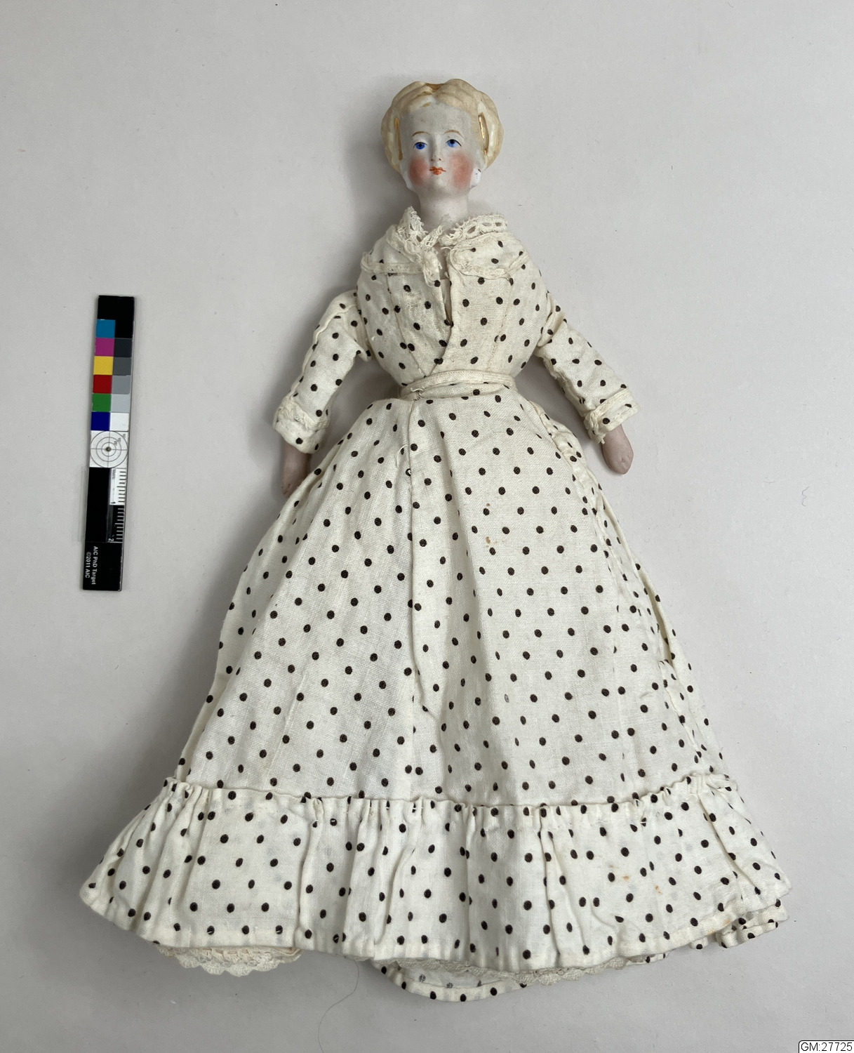 - Docka med huvud och armar i porslin och stoppad kropp. Klädd i vit 2-delad klänning med svarta prickar, röda strumpor och vita underkläder i bomull.