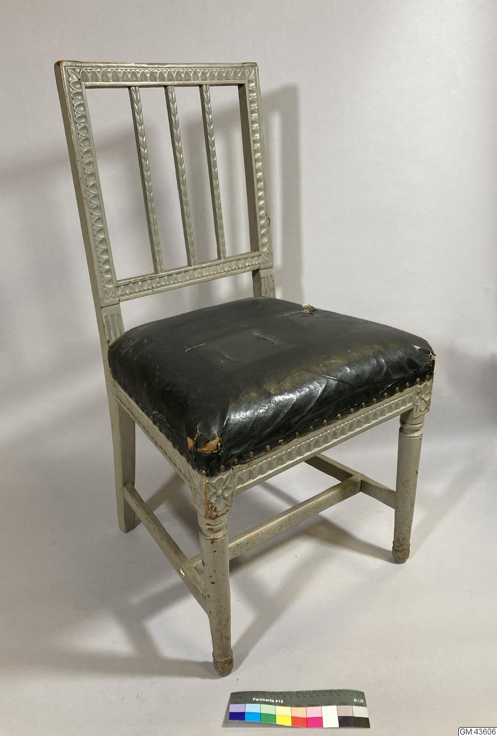 - Gustaviansk stol. Gråmålad med en konstläderklädd sits.