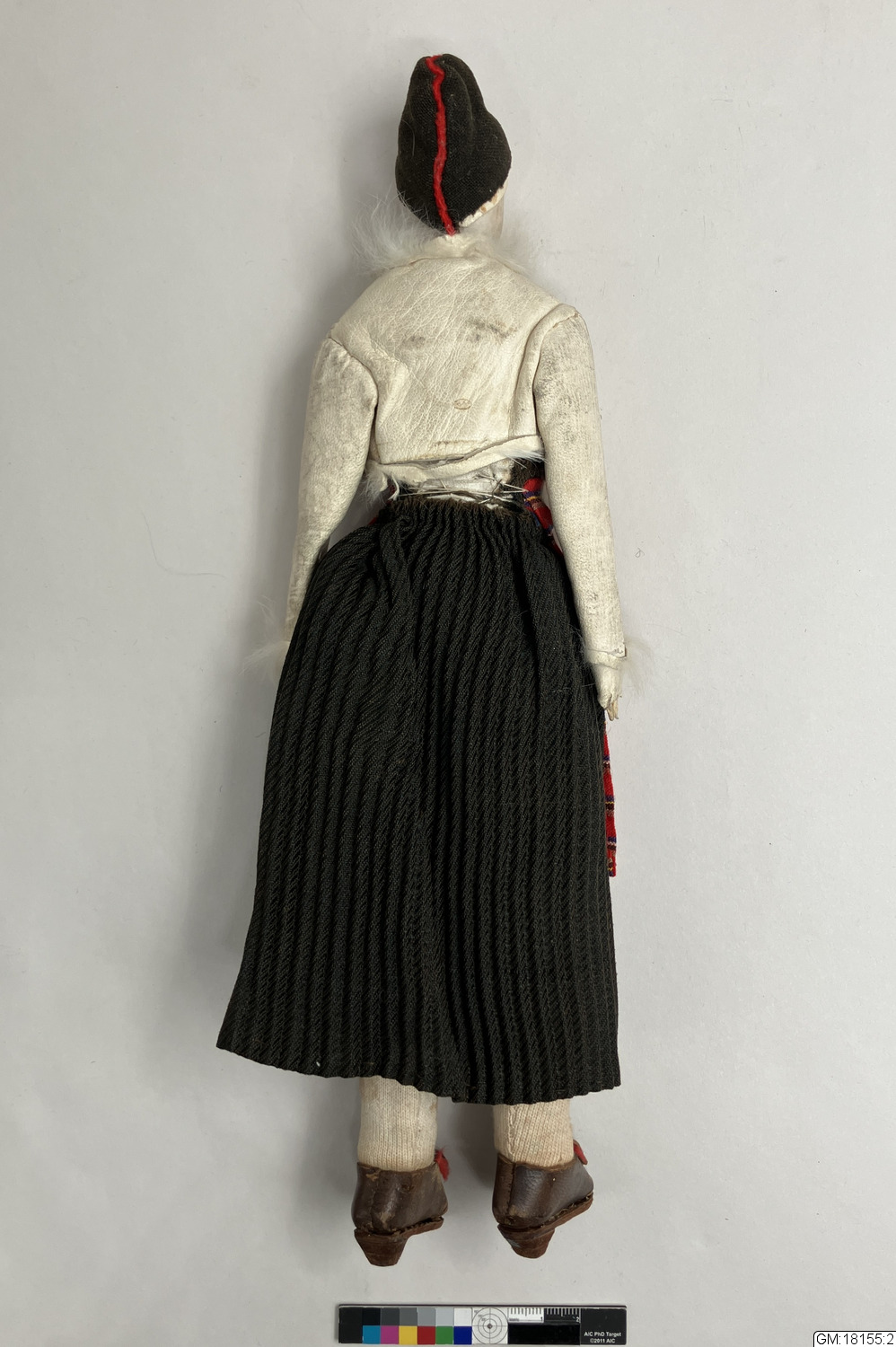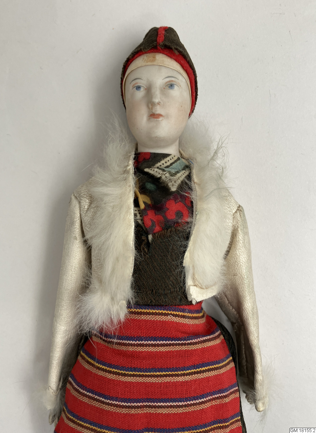 - Kvinnodocka med huvud av porslin och stoppad kropp klädd i folkdräkt.