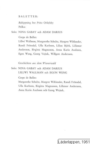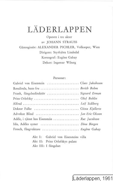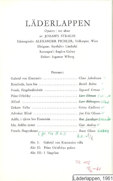 - "Operett Läderlappen, Meilhac Halévy, musik J. Strauss, 5.5.1961, kostym: Inga Svensson." /ur katalogkort 2011-09-26 lzg