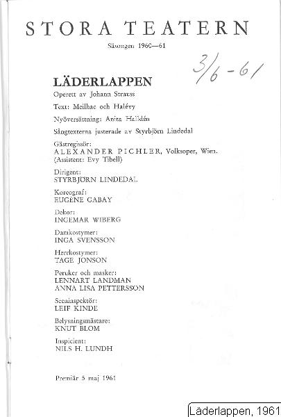 - "Operett Läderlappen, Meilhac Halévy, musik J. Strauss, 5.5.1961, kostym: Inga Svensson." /ur katalogkort 2011-09-26 lzg