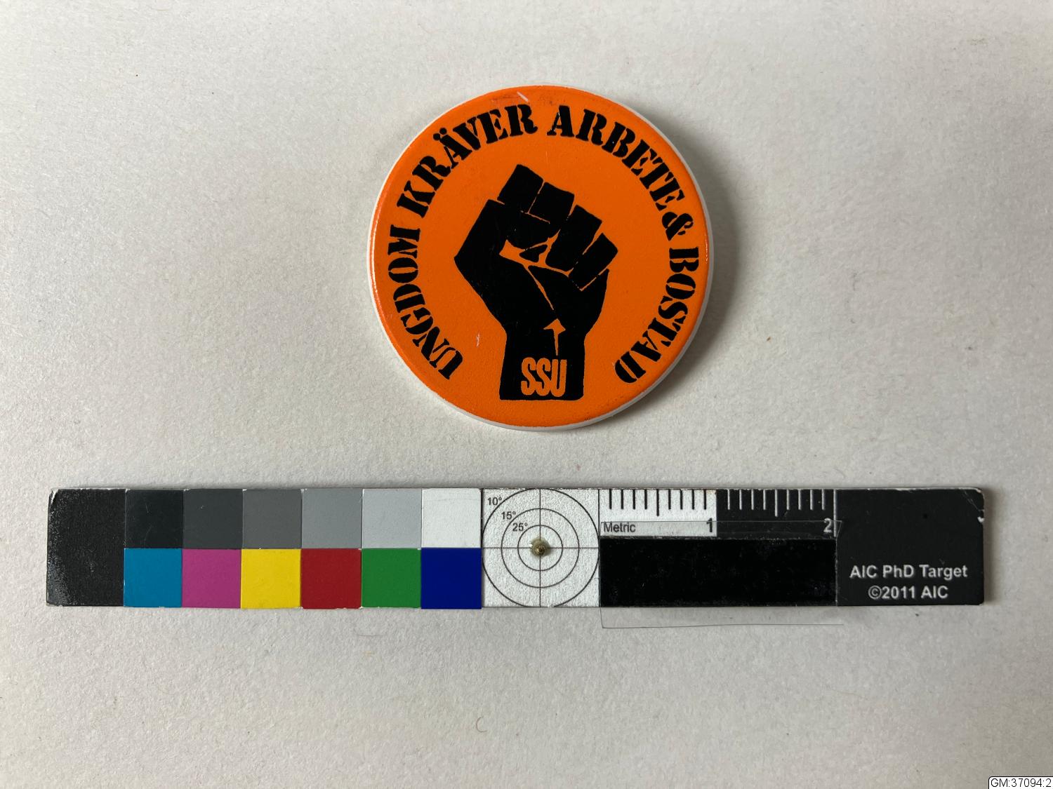 - ett av två olika rockmärken för SSU "Sveriges Socialdemokratiska Ungdomsförbund" rött märke med gul text