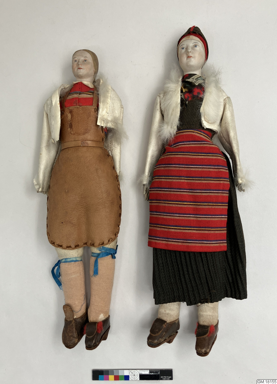 - Ett par dockor, en man och en kvinna i folkdräkt. Huvud i porslin, händer i skinn ochstoppad kropp. Dockorna har jacka i pälskantat skinn, skor av läder och mansdockan ett skinnförkläde.